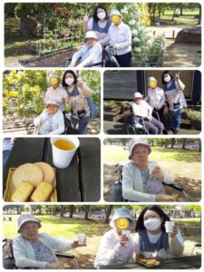 綺麗なお花を観賞したあと、日陰にあったテーブルでお茶とお菓子をいただきました😋「幸せだねぇ🎵」「風が気持ちいいねぇ🎶」と楽しい時間を過ごしました😄