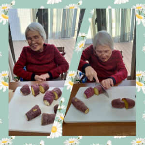 今日のおやつは焼き芋。ちょっと大きいので食べやすい大きさに切っていただきました。