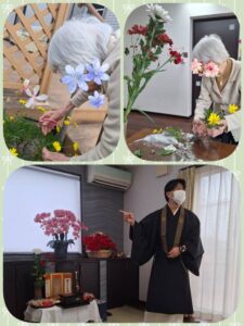 準備では「黄色が入るとバランスがもっと良くなるわね♪」と、花壇の花も入れて生けて下さいました。お坊さんとのお話しも笑顔溢れる時間でした。