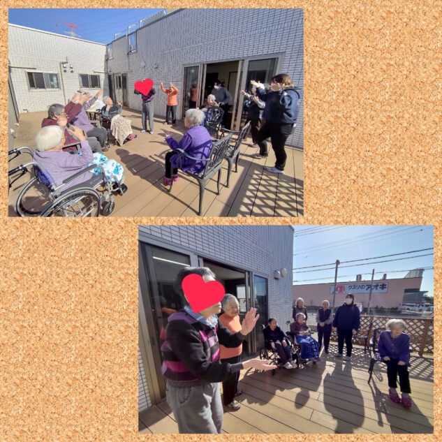 お天気がいいのでウッドデッキで日向ぼっこ。皆で体操したり歌って踊ったりと楽しかったです。