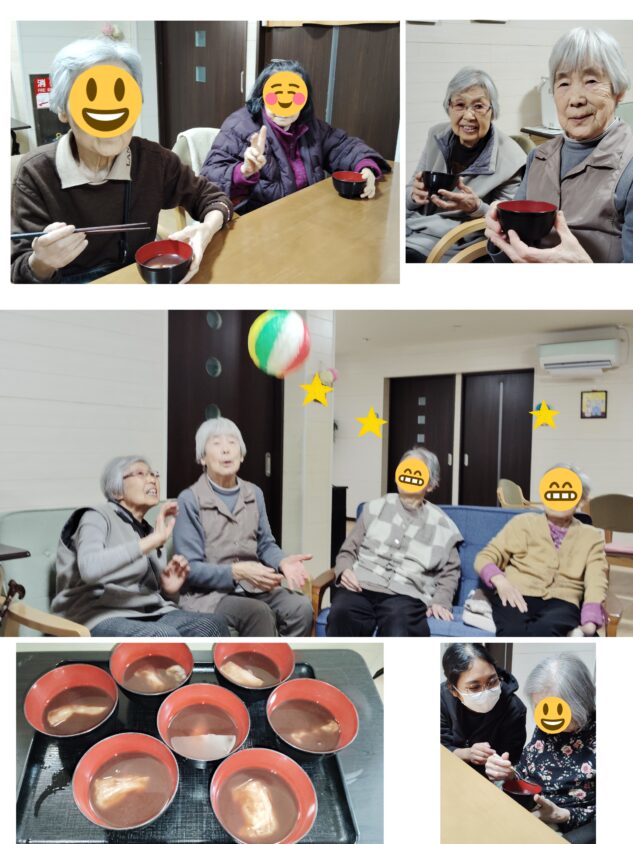 紙風船で運動を楽しんだあと、おやつにお汁粉をいただきました😄