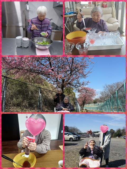 いちごパフェ作り、昼食の準備、河津桜を見にお出かけ♪ とっても良いお天気で気持ち良くお散歩😊 お昼ご飯が楽しみですね💖
