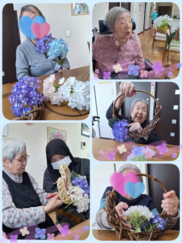 紫陽花のリースを作っています!「この組み合わせがステキね🌼どう??」と、皆さんのアイデアで制作中です♪出来上がりが楽しみです!