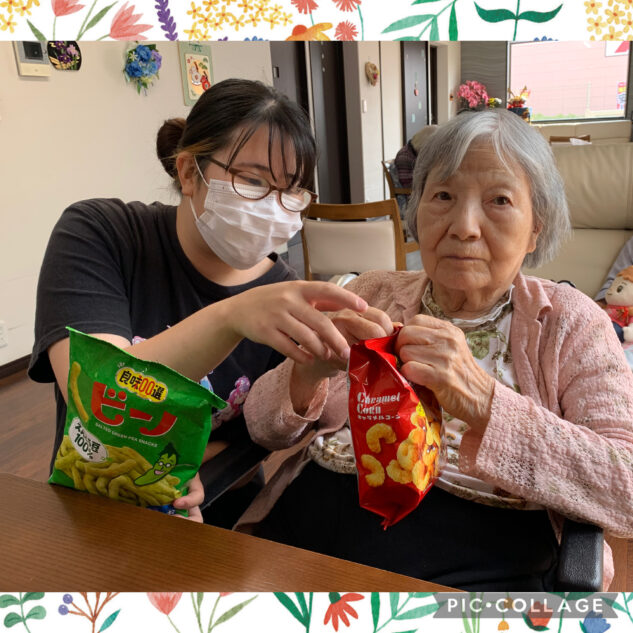 ご家族様よりお菓子をいただきました!「美味しそうね、いただきましょう!」と早速袋を開封!いつもありがとうございます😊