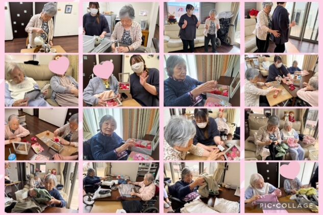 お茶🍵で一息ついた後は、「踊りましょうよ♪」と、踊り方を教えてくださっています😊 その後は皆さんで歌♬、花飾りを作って。中に入っていた英語のカードを訳していただきました!