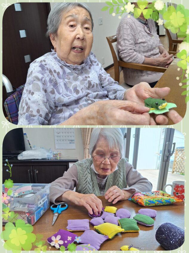 端午の節句に向けて、飾り作りです。「あと10個作る??」と、次々に作って下さっています✨「かわいいかエルちゃん♪」と、カエルの飾りも出来ました!